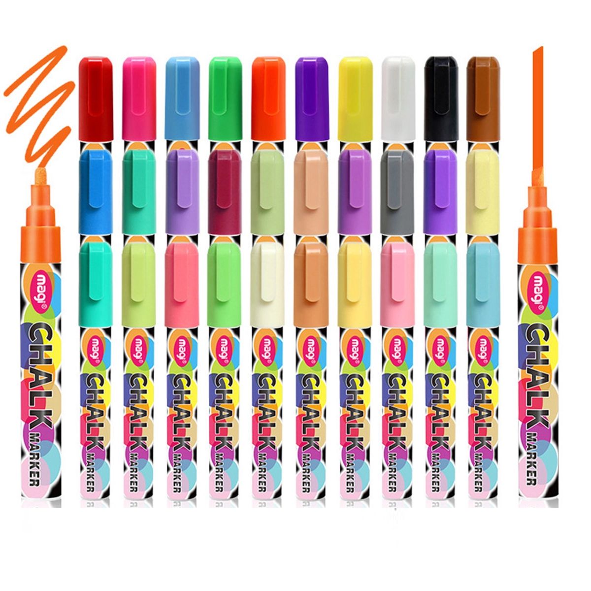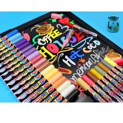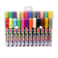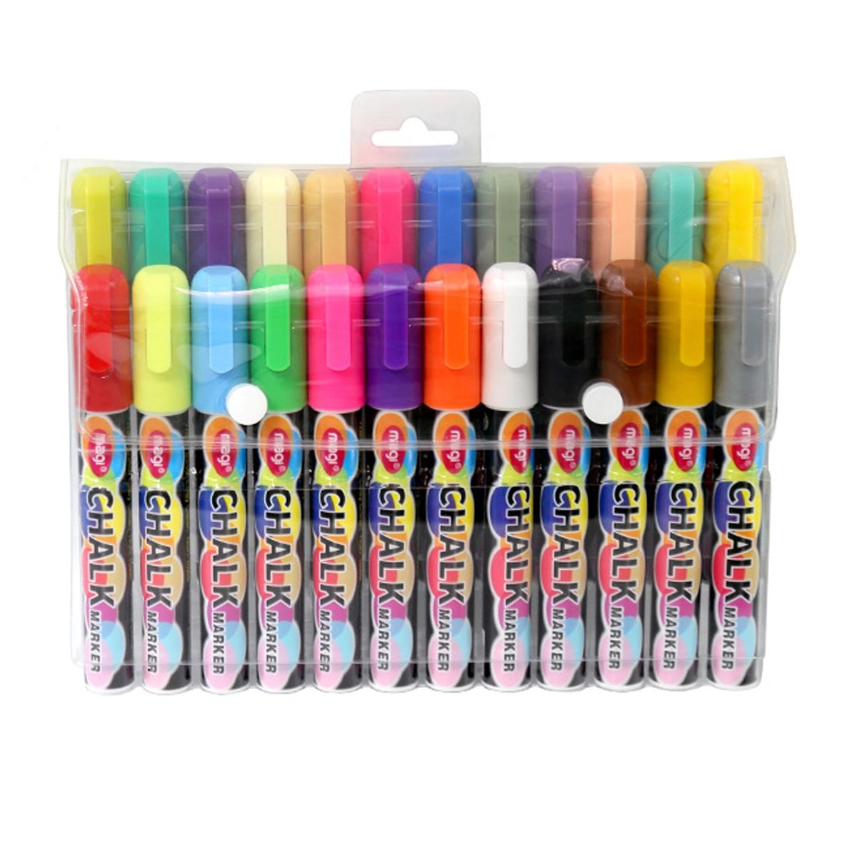 Pack of 24 use a high-quality, super-concentrated liquid chalk Ink that provides bright, vibrant colors each and every time. Great for Restaurant Menu Boards, Bistro Boards, White board, LED Writing Board, Window & Mirror markers, Car Windows, Kids art, School work, Marking dates on food Containers, Ceramic Mugs, Chalkboard contact paper, Chalkboard Labels, Thank you stickers.When using on all the recommended surfaces, the Liquid Chalk markers can be erased easily by wiping the area with a paper towel or damp cloth (included).The price on this page is 24 color set, we also have 8 color, 10 color, 12 color, 36 color, 46 color set